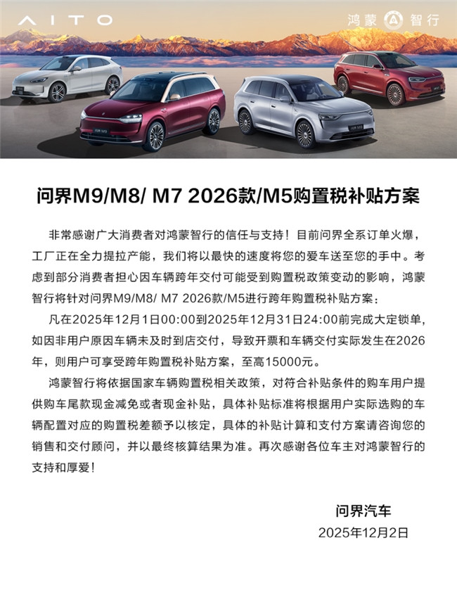 更彰显品牌长期主义承诺的,是对用户潜在权益的前瞻性保障。针对在2025年12月1日至12月31日期间完成大定锁单的用户,若因非用户原因导致车辆在2026年交付,可享最高15000元购置税补贴。此外,即日起至2026年1月5日下定的用户,还可领取至高价值60000元的综合购车权益,涵盖选配基金、舒享套装等多项重磅福利,让高品质体验一步到位。