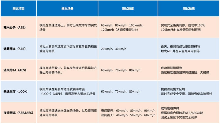 紧急制动(AEB)是主动安全的基础核心功能,测试模拟高速路前方出现故障车的突发场景,在驾驶员不采取任何制动操作的情况下,验证车辆自主刹停的可靠性。测试分别选取60km/h、80km/h、100km/h、120km/h四个常用高速速度区间,每个速度层级重复测试三次。
